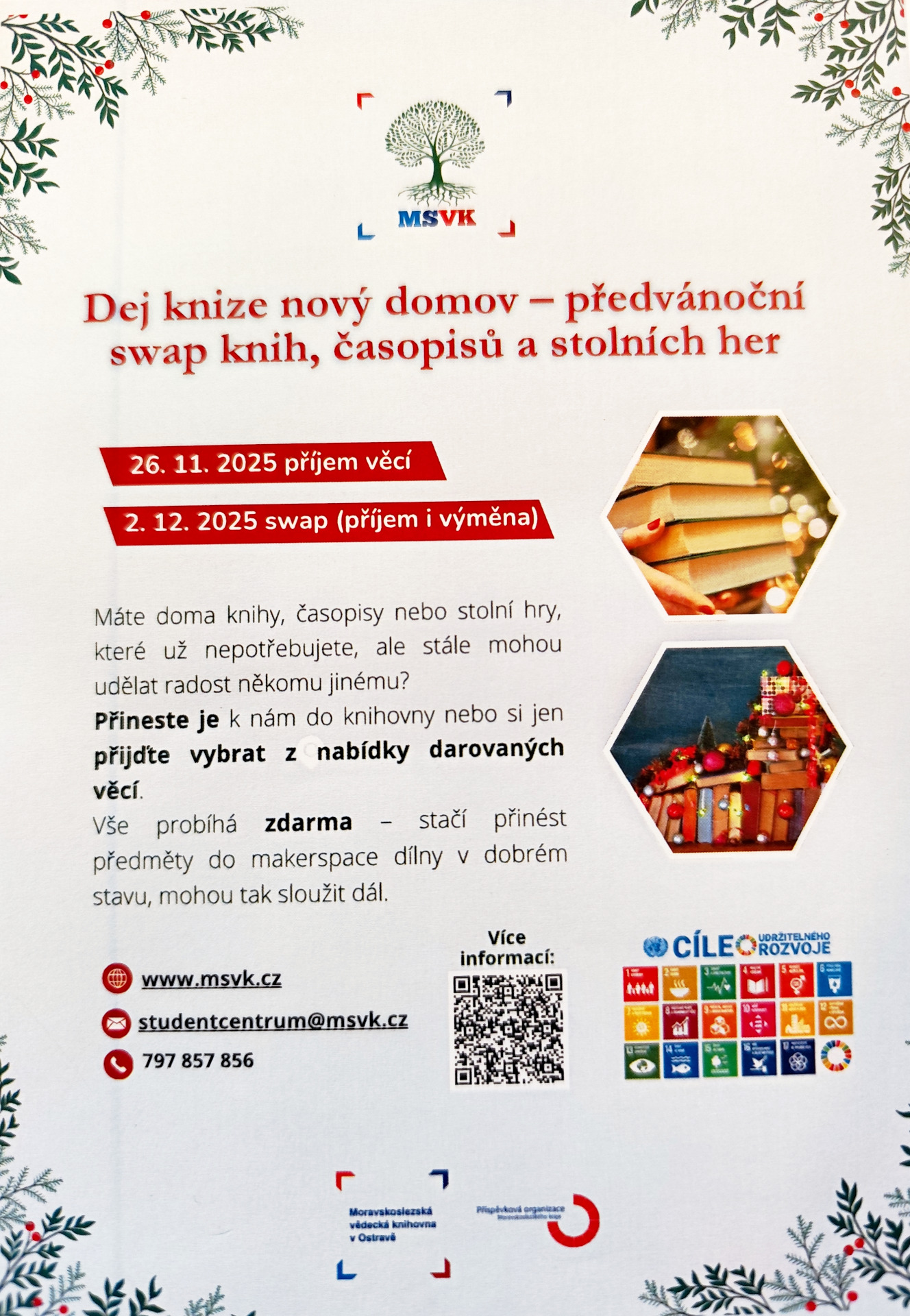 Moravskoslezská vědecká knihovna organizuje užitečnou akci, při které můžete nabídnout jinému zájemci svoje přečtené knihy, časopisy a také darovat stolní hry. Stačí jen v čase od 8 do 18 hod. přinést do MSVK své ,,poklady", jež mohou potěšit ještě někoho jiného. Vše doručte do makerspace dílny v levém křídle ostravské Nové radnice ve dnech 26. 11. a 2. 12. 2025.