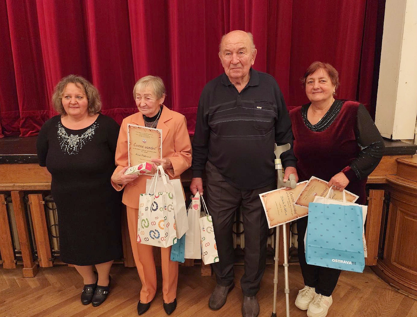 Po úvodních projevech byl vyhrazen čas na ocenění těch členů, kteří v jednotlivých organizacích výrazně obohacují jejich činnost. Celkem bylo diplomem a drobnými dárky potěšeno 15 seniorů a seniorek z Frýdku-Místku, Petřkovic a Ostravy. Za naši ostravskou MO SČR to byli: Eliška Redková, Bedřich Richter, Zdeněk Kudělka, Katarina Olahová a Anna Pinterová. Všichni měli z kladného hodnocení své činnosti radost.