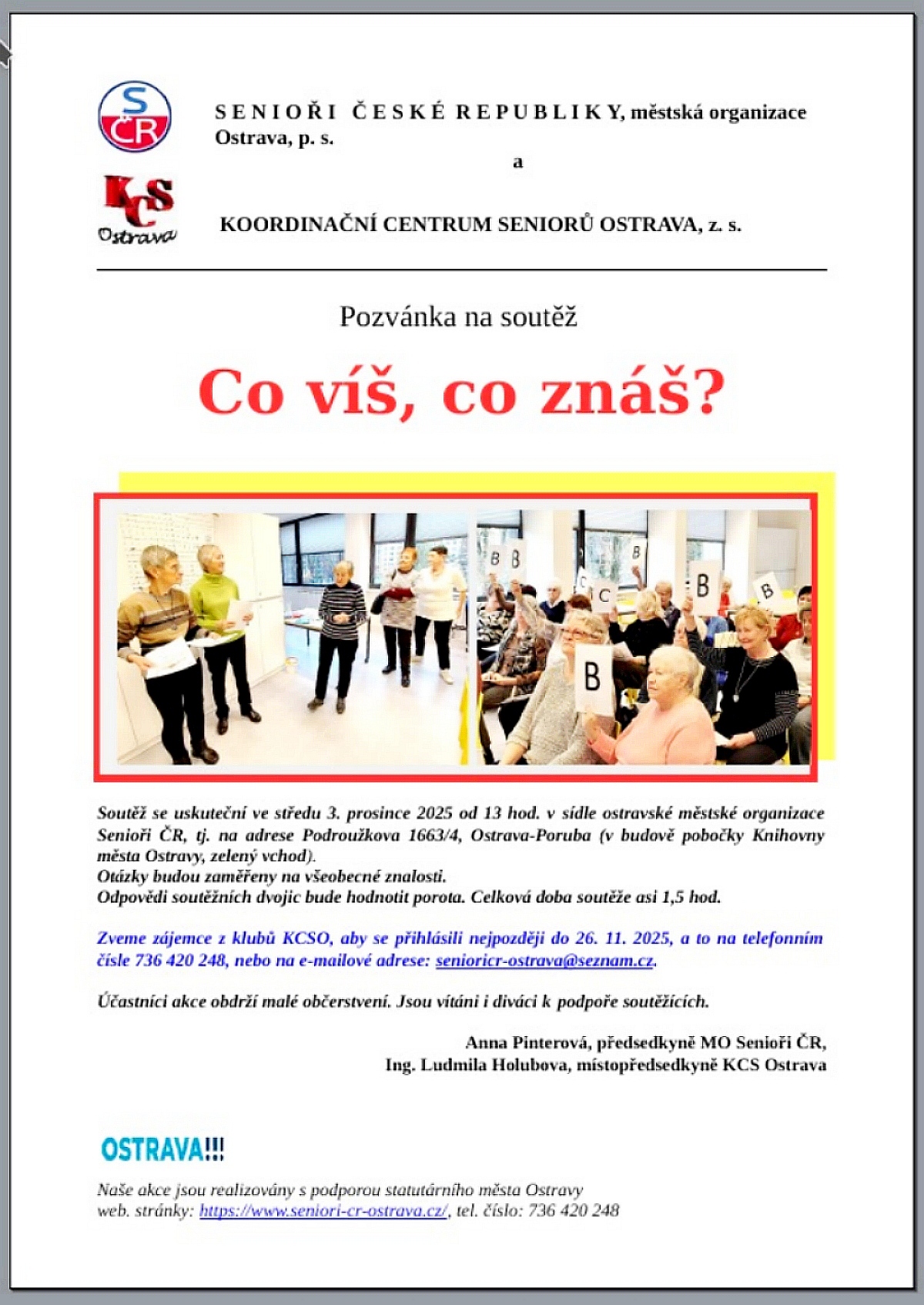 Oblíbená vědomostní soutěž Co víš, co znáš? se uskuteční 20. listopadu 2024 od 10 hodin ve velké místnosti našeho sídla v Ostravě-Porubě (budova Knihovny města Ostravy, Podroužkova ul. 1663/4, zelený vchod). Soutěžit budou opět dvoučlenná družstva. Přihlášky přijímá Anna Pinterová. Akce se pořádá ve spolupráci s Koordinačním centrem seniorů Ostrava také pro jeho členské organizace.