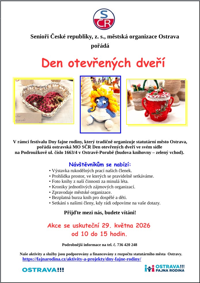 Ostravská městská organizace Senioři ČR připravuje Den otevřených dveří v rámci Dnů fajne rodiny, které pořádá statutární město Ostrava. Více informací: